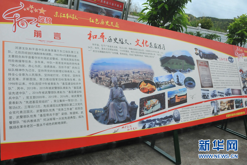 7月18日,網絡媒體國防行記者團參觀武警廣東總隊河源市支隊和平縣中隊。圖為營區院內介紹中隊歷史的展板。新華網記者 黃河攝