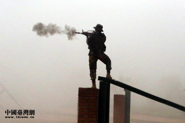 參加反恐演練的第78集團軍某特戰旅戰士在濃煙中掩護射擊。(中國臺灣網 陳佳慧 攝)