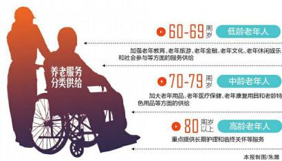 強化養老服務分類供給。針對60—69周歲低齡老年人加強老年教育、老年旅游、老年金融、老年文化、老年休閑娛樂和社會參與等方面的服務供給;針對70—79周歲中齡老年人加大老年用品、老年醫療保健、老年康復用具和老齡特色用品等方面的供給;針對80周歲以上高齡老年人養老服務需求,重點提供長期護理和臨終關懷等服務。