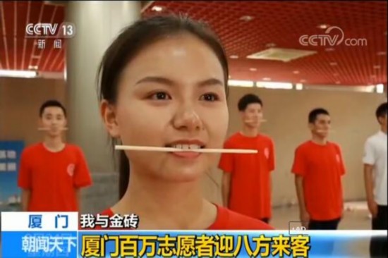 端莊的體態,整齊的動作,這三十個年輕的面孔來自廈門大學。他們正為金磚領導人廈門會晤進行禮儀訓練。嘴里含一根筷子,來保持微笑的弧度;模擬可能出現的場景,以隨時從容應變。
