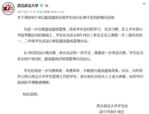 有媒體報(bào)道,9月18日一早,西北政法大學(xué)學(xué)生們?yōu)槌孔x打卡排起了長(zhǎng)長(zhǎng)的隊(duì)伍。部分同學(xué)表示,幾千學(xué)生,就4個(gè)打卡機(jī)能用,“成功刷臉完成晨讀堪比春運(yùn)搶火車(chē)票!”當(dāng)日中午,學(xué)校官方微博就此事發(fā)布通告稱,新的刷臉打卡的方式還存在不足,將于19日起恢復(fù)原管理辦法。