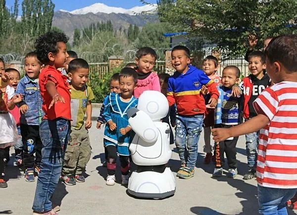 8月30日,拜城縣老虎臺(tái)鄉(xiāng)中心幼兒園的孩子在和機(jī)器人互動(dòng),充分感受科技的魅力。