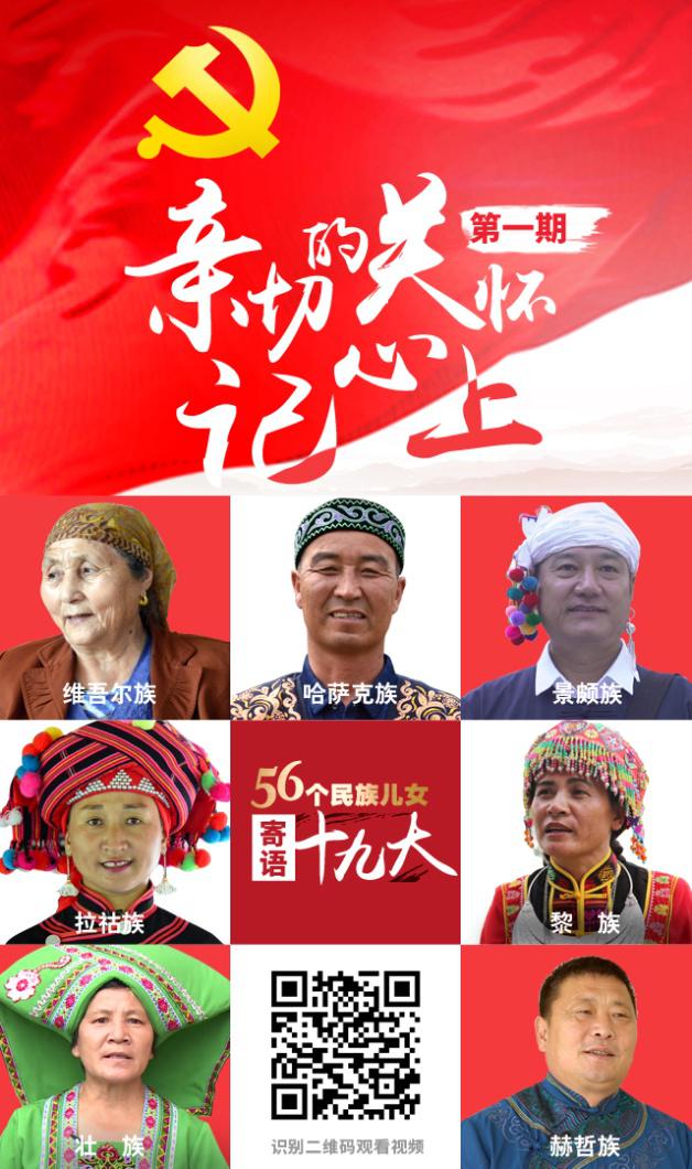為喜迎黨的十九大勝利召開,由中央網信辦、國家民委、人民日報社指導,人民網出品的大型系列微視頻“56個民族兒女寄語十九大”,今起在人民網推出,第一期為《親切的關懷記心上》,共7集。
