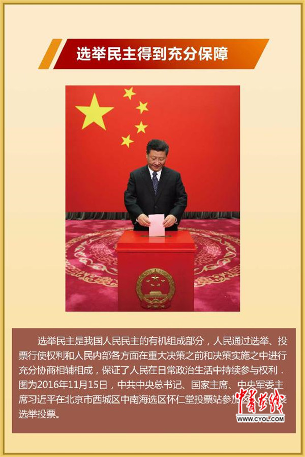 展區內,一張2016年11月15日,中共中央總書記、國家主席、中央軍委主席習近平在北京市西城區中南海選區懷仁堂投票站參加區人大代表選舉投票的照片吸引了王玉(化名)的目光。今年剛剛參加工作的王玉在大學時曾參加過一次人大代表的選舉投票,“那是我第一次參加人大代表的選舉投票,當時感覺十分神圣,今天看到總書記和我們一樣行使著自己的投票權,十分親切!”