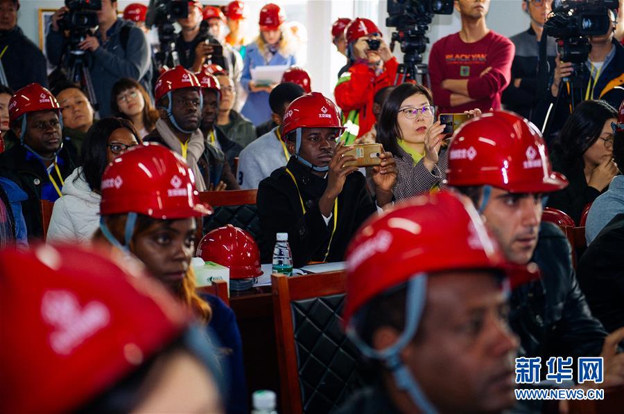 10月16日,中外記者在北京新機場建設工地觀看相關視頻介紹。當日,近40家參加十九大新聞報道的中外媒體的60多名記者前往北京大興采訪新機場建設項目。自10月12日起,十九大新聞中心組織包括北京中軸線、基層黨建、故宮在內15條線路的采訪活動,幫助中外記者更好地了解中國發展成就。新華社記者 劉金海