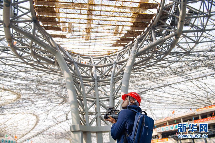 10月16日,南蘇丹廣播集團記者阿湯加在北京新機場建設工地采訪拍攝。當日,近40家參加十九大新聞報道的中外媒體的60多名記者前往北京大興采訪新機場建設項目。自10月12日起,十九大新聞中心組織包括北京中軸線、基層黨建、故宮在內15條線路的采訪活動,幫助中外記者更好地了解中國發展成就。新華社記者 劉金海 攝