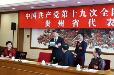 2017年10月19日,習近平同志參加黨的十九大貴州省代表團討論。這是遵義市播州區花茂村黨總支書記潘克剛將一幅鳥瞰村子新貌的照片送到習近平面前。習近平起身接過照片,邊看邊稱贊:“這是風景畫,很漂亮!”