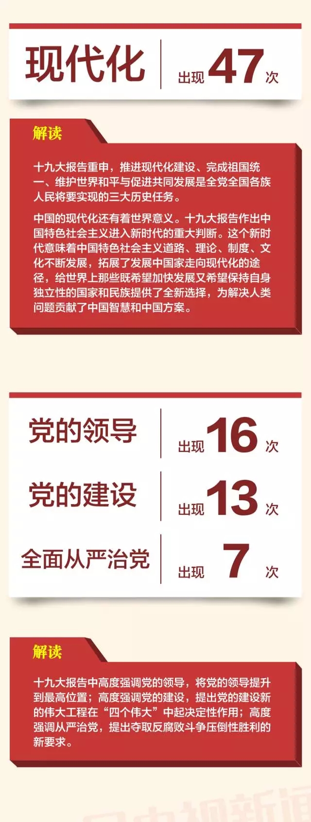十九大報告中,許多重要關(guān)鍵詞被反復(fù)提及!靶聲r代”一詞首次出現(xiàn)在報告中,出現(xiàn)頻率也達到了30余次。此外,“中國特色社會主義”、“現(xiàn)代化”、“黨的領(lǐng)導(dǎo)”等詞也在報告中占據(jù)了重要的位置。