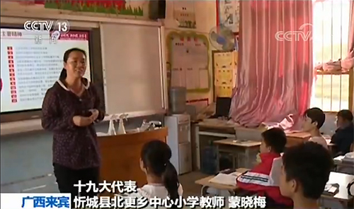 十九大代表蒙曉梅是廣西來賓的一名普通鄉村教師,回到學校,她精心制作了宣講課件,將十九大報告精神融入校園。