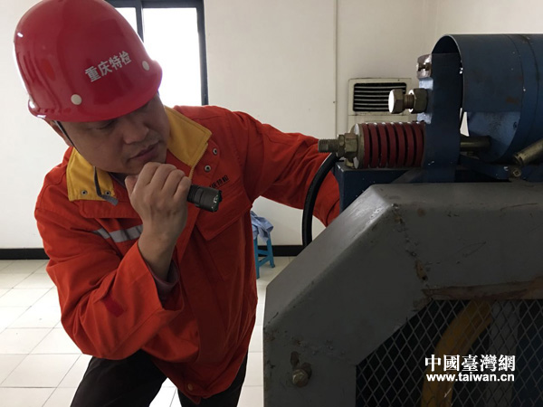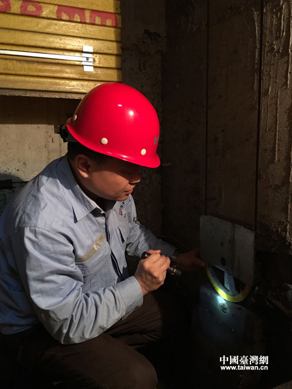 張東平在進(jìn)行電梯故障檢測(cè)與維修。(重慶市特種設(shè)備檢測(cè)研究院供圖 中國(guó)臺(tái)灣網(wǎng)發(fā))