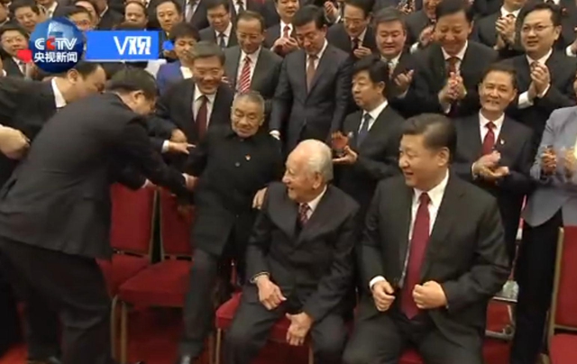 握手后,習總書記回到隊伍中間,準備跟大家合影。“總書記看到我和黃旭華,就邀請我們坐到他的身旁。”黃大發說,總書記握住他們的手,微笑著問候說:“你們這么大歲數,身體還不錯。你們別站著了,到我邊上坐下。”