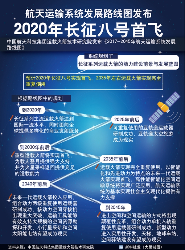 航天運(yùn)輸系統(tǒng)發(fā)展路線圖發(fā)布:2020年長征八號(hào)首飛 新華社發(fā) 大巢制圖