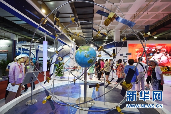 2017年6月9日,參觀者在第二十屆中國北京國際科技產(chǎn)業(yè)博覽會(huì)上參觀展出的北斗衛(wèi)星導(dǎo)航系統(tǒng)模型。新華社記者 鞠煥宗 攝