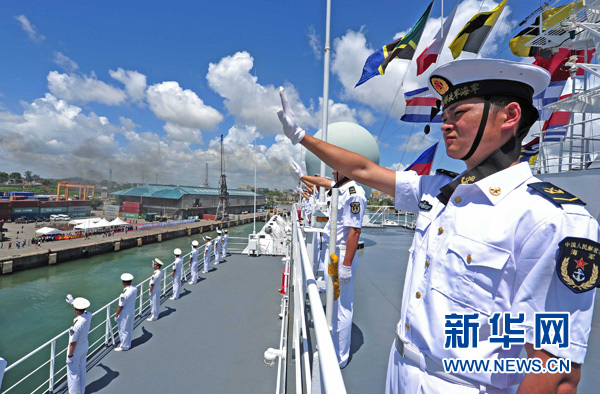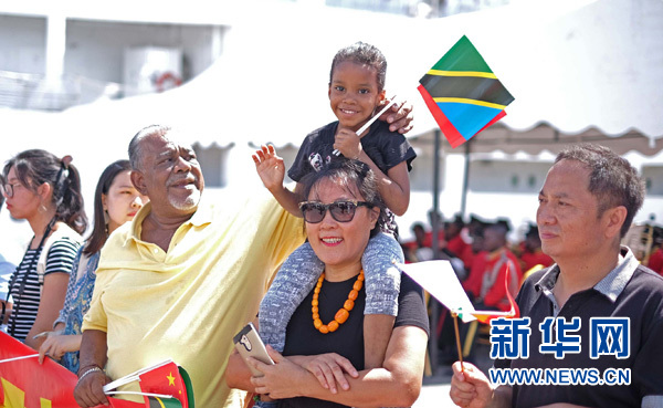 11月26日,在坦桑尼亞達累斯薩拉姆港,中國海軍和平方舟醫院船官兵向前來送行的人們揮手告別。新華社發(江山 攝)