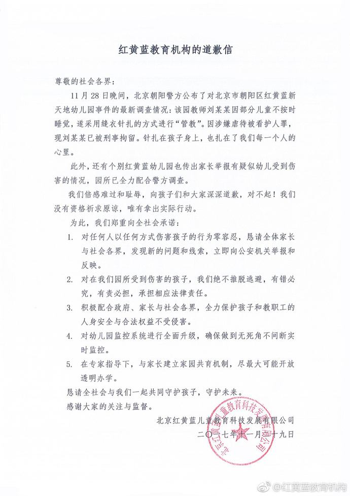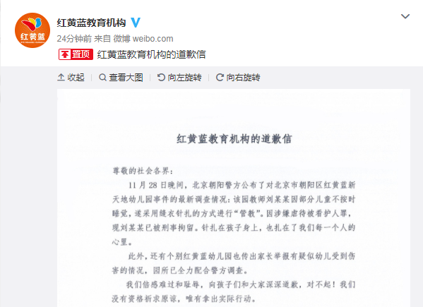 紅黃藍教育機構發布道歉信:深感恥辱,將升級監控