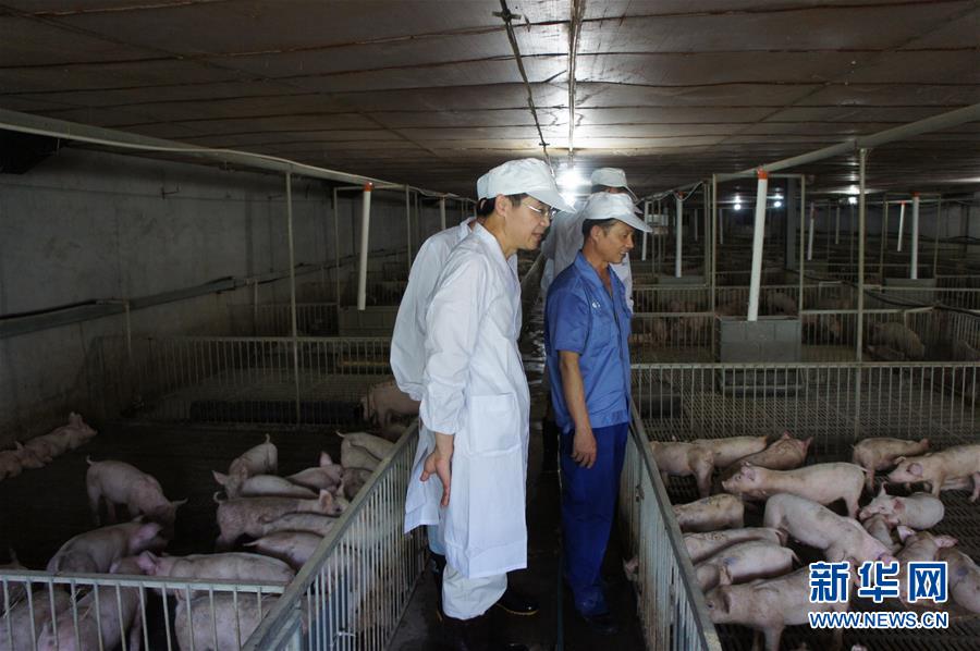 王一成(前)帶領學生在基層養豬場考察(資料照片,2013年8月攝)。新華社發