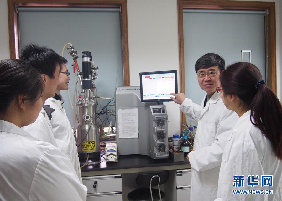 王一成(右二)在浙江省農業科學院畜牧獸醫研究所向學生講解干擾素發酵實驗(資料照片,2012年5月攝)。 新華社發