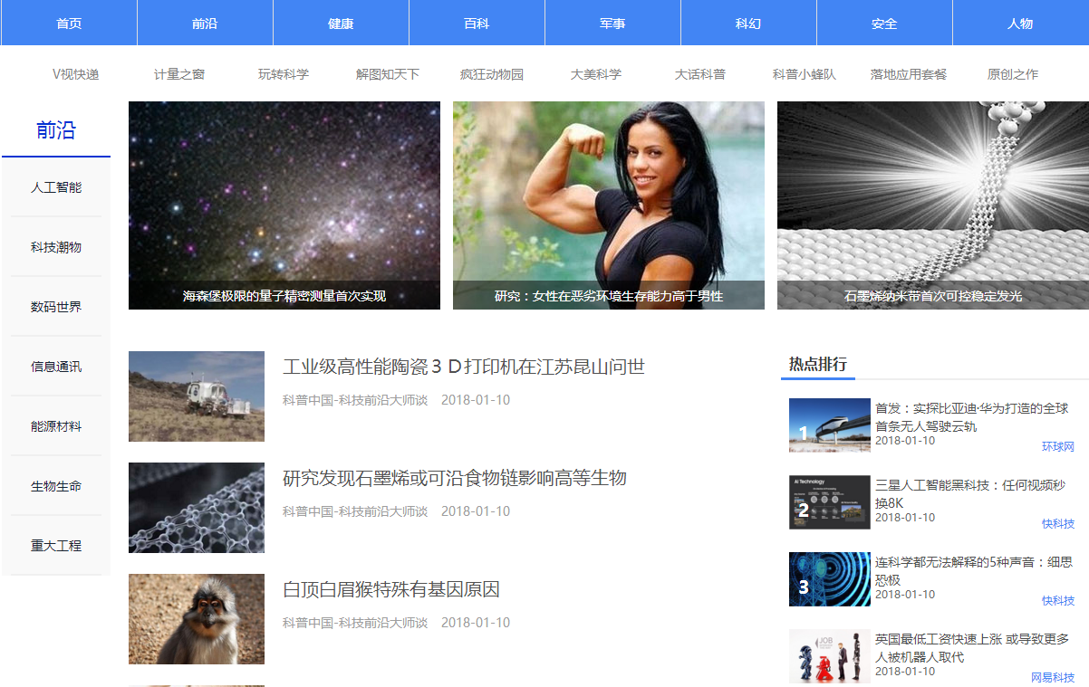 作為中國科普的重要傳播窗口,科普中國網2.0版本在內容方面,以市場調研為基礎,以科普內容的學科門類及用戶所關注的熱門內容為分類依據,從傳播學角度對過往欄目進行整合重構,最終形成了包括前沿、健康、軍事等七大頻道。同時,還針對時下熱門,以及有趣的科普知識點進行整合,通過專題頁面,以科普游戲、視頻、漫畫等多樣化、參與和趣味感十足的形式,為廣大網友帶來全新的科普體驗。