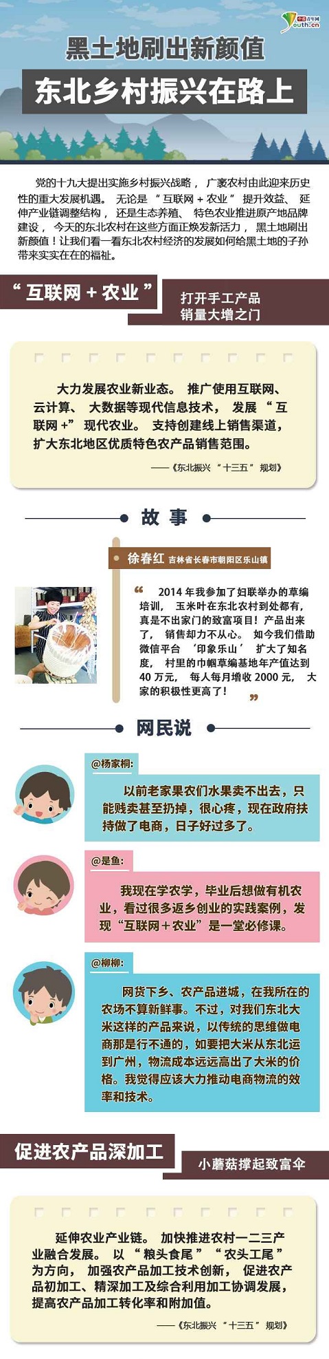 中國青年網(wǎng)北京1月23日電(記者 楊月 實習(xí)記者 胡云茹 曹若鴻)黨的十九大提出實施鄉(xiāng)村振興戰(zhàn)略,廣袤農(nóng)村由此迎來歷史性的重大發(fā)展機遇。無論是“互聯(lián)網(wǎng)+農(nóng)業(yè)”提升效益、延伸產(chǎn)業(yè)鏈調(diào)整結(jié)構(gòu),還是生態(tài)養(yǎng)殖、特色農(nóng)業(yè)推進(jìn)原產(chǎn)地品牌建設(shè),今天的東北農(nóng)村在這些方面正煥發(fā)新活力,黑土地刷出新顏值!讓我們看一看東北農(nóng)村經(jīng)濟的發(fā)展如何給黑土地的子孫帶來實實在在的福祉。