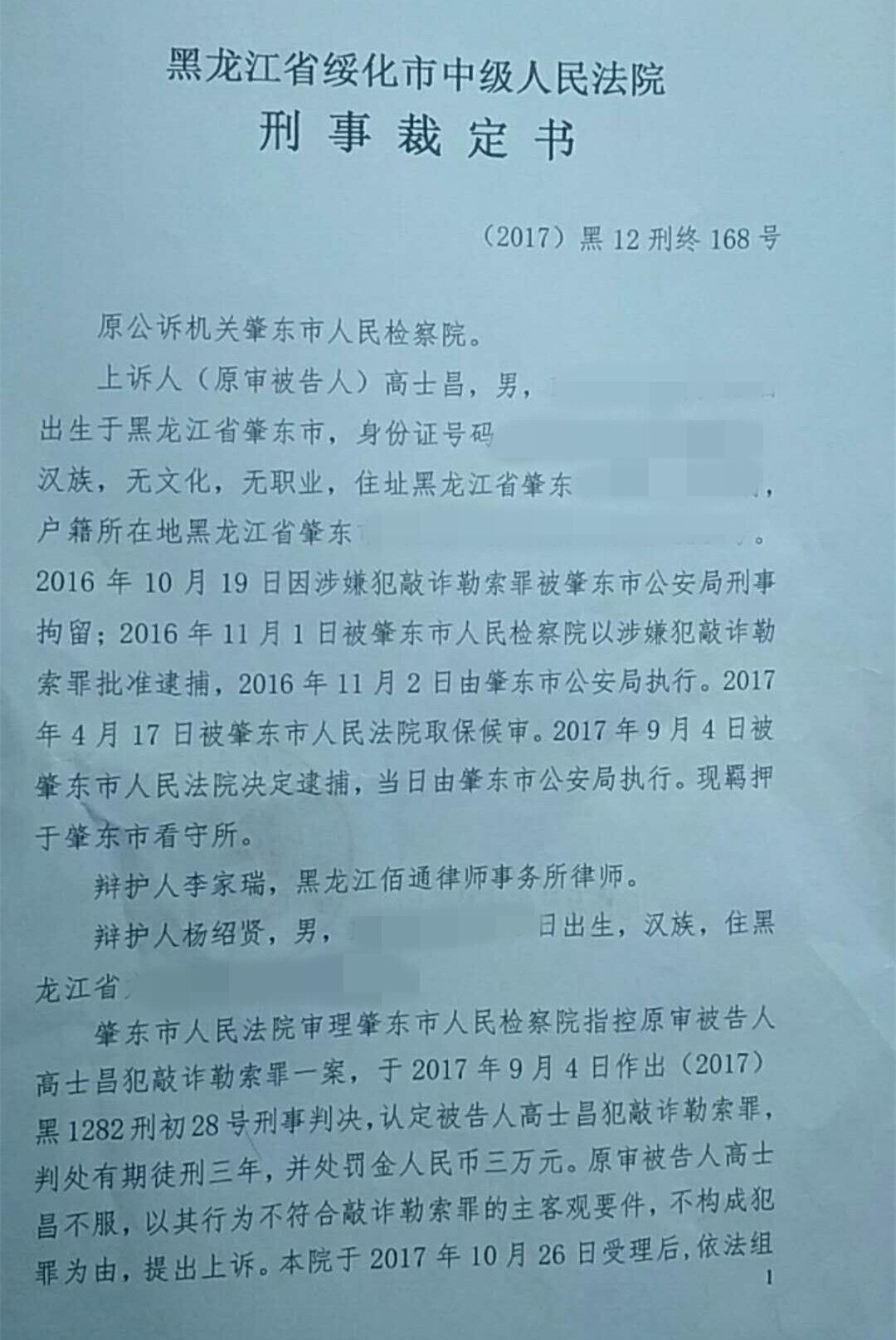 1月24日上午,高士昌的辯護(hù)人從肇東市人民法院領(lǐng)到了綏化市中級(jí)人民法院作出的《刑事裁定書》,并立即來到高士昌家,送到高士昌妻子手中。