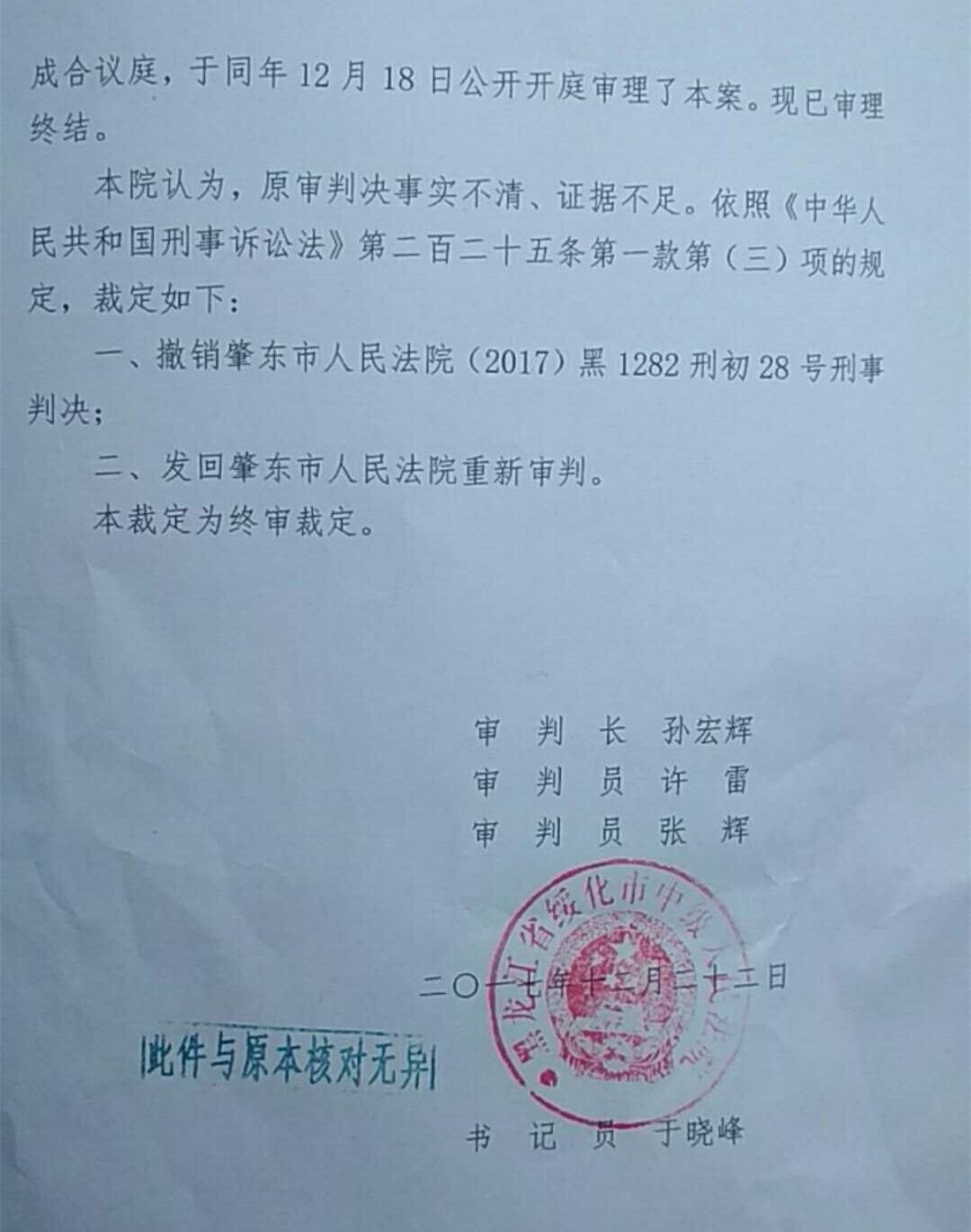 她手里拿著的紙張,雖然只有兩頁(yè),卻重似千斤——這是她剛剛看到的綏化市中級(jí)人民法院于2017年12月22日作出并交由肇東市人民法院送達(dá)的《刑事裁定書》。