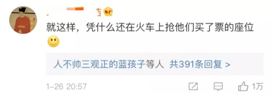 這位網(wǎng)友說(shuō):“就這樣,憑什么還在火車上搶他們買了票的座位?”