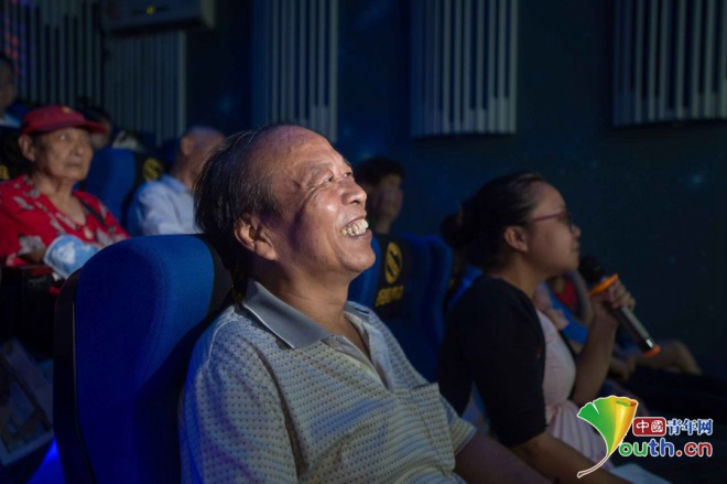 2017年7月,杜誠誠(右)在盲人電影院講解經(jīng)典電影《特別的愛》,一位老人沉浸在劇情中,笑得很開心。本人供圖
