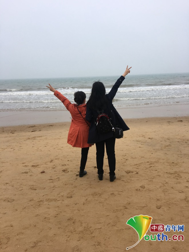 2018年年初,杜誠誠與好友海邊比Yeah。本人供圖