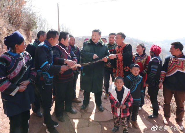 【彝族同胞向習總書記敬獻查爾瓦,唱起《留客歌》】離開昭覺縣解放鄉火普村時,村里的男女老幼排起長長的隊伍,同總書記依依惜別。村黨支部書記向總書記獻上彝族傳統服飾查爾瓦,表達對總書記的愛戴和感激?倳浬砼闋柾撸l親們握手道別!傲暱倳浛ㄉ成常ㄖx謝)”“習總書記庫史木撒(新年好)”“習總書記子莫格尼(吉祥如意)”,問候和祝福聲此起彼伏。隊伍里有人唱起彝族民歌《留客歌》,鄉親們跟著唱了起來。深情的歌聲表達了彝族同胞對黨的感恩之情,唱響了對美好生活的無限憧憬。(記者:霍小光 攝影:鞠鵬、謝環馳)