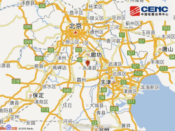 中國日報網2月12日電 據中國地震臺網正式測定:02月12日18時31分,在河北省廊坊市永清縣(北緯39.37度,東經116.67度)發生4.3級地震,震源深度20公里。
