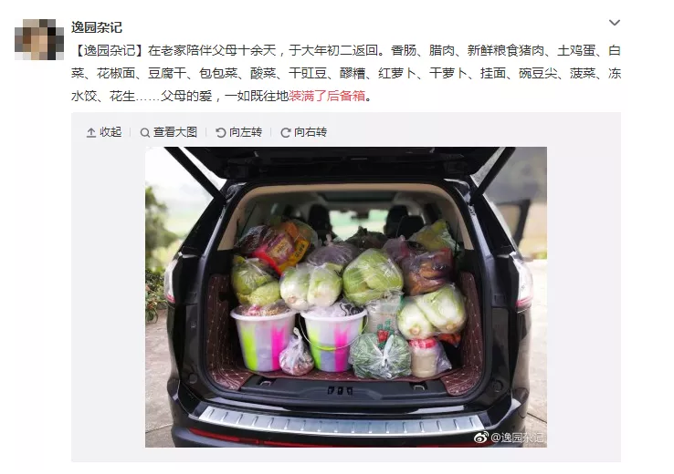 昨日,游子們從家這個(gè)港灣里,鳴笛啟航,奔向遠(yuǎn)方。除了對(duì)鄉(xiāng)愁的百轉(zhuǎn)千回,更有親情的濃郁化不開(kāi)。這幾天,網(wǎng)友們都在微博里曬圖,“媽媽給裝的后備箱”的話題,一時(shí)成了熱點(diǎn)——“親手做的馬蹄糕”“最愛(ài)的家鄉(xiāng)小柚柑”“一大罐子土榨花生油”“秋天腌的糖蒜”……后備箱被爸媽塞得滿滿的,不愿帶還不高興。于是乎,調(diào)皮的網(wǎng)友留言:“明年我開(kāi)個(gè)貨車回來(lái)過(guò)年!”