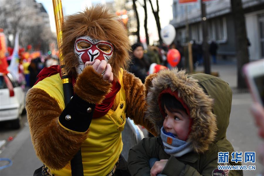 2月25日,在法國巴黎,“美猴王”在春節(jié)彩妝大游行中與一名小男孩互動。新華社發(fā)(杰克·陳 攝)
