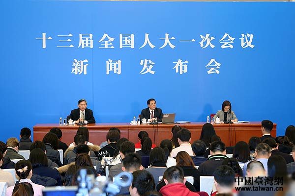 十三屆全國人大一次會(huì)議舉行新聞發(fā)布會(huì),發(fā)言人張業(yè)遂向中外媒體介紹本次大會(huì)有關(guān)情況并回答記者提問。(中國臺(tái)灣網(wǎng) 何建峰 攝)
