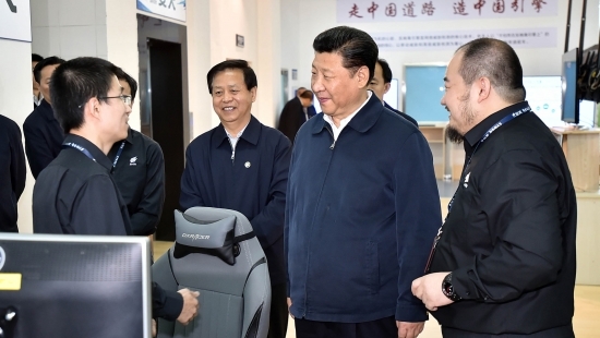 習近平總書記強調,要深入貫徹黨的十九大精神,增強使命感和責任感,真抓實干,緊抓快干,不斷開創新時代軍民融合深度發展新局面。圖為習總書記在視察調研中聽取民企科技人員介紹網絡安全技術研發情況。