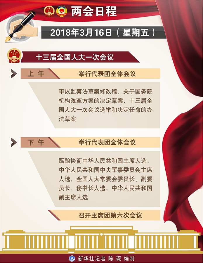 新華社北京3月15日電 十三屆全國人大一次會議16日全天舉行代表團全體會議,上午審議監察法草案修改稿,關于國務院機構改革方案的決定草案,十三屆全國人大一次會議選舉和決定任命的辦法草案;下午醞釀協商中華人民共和國主席人選,中華人民共和國中央軍事委員會主席人選,全國人大常委會委員長、副委員長、秘書長人選,中華人民共和國副主席人選。下午,召開主席團第六次會議。