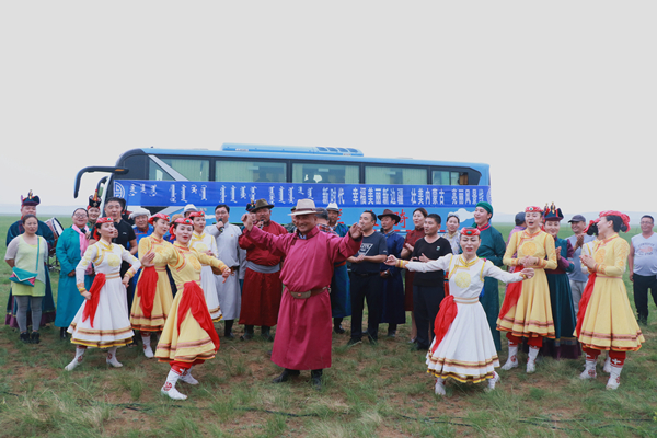 孟克吉日嘎拉與朋友們?cè)诓莸厣舷囟瑖砂牖⌒危硎苤矍暗谋硌荨T谝皇赘枨献喹h(huán)節(jié),孟克吉日嘎拉和朋友們自然地打起了節(jié)拍,跟著唱了起來(lái)。碧草幽幽的草原空曠無(wú)邊,風(fēng)從遠(yuǎn)處吹來(lái),悠揚(yáng)的歌聲在草地上空飄揚(yáng)。這一刻,烏蘭牧騎隊(duì)員和觀眾成了這片草地的主角。