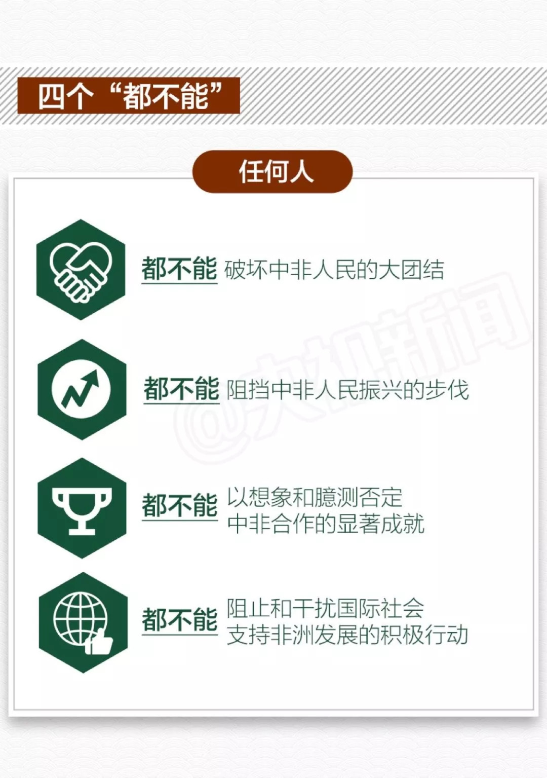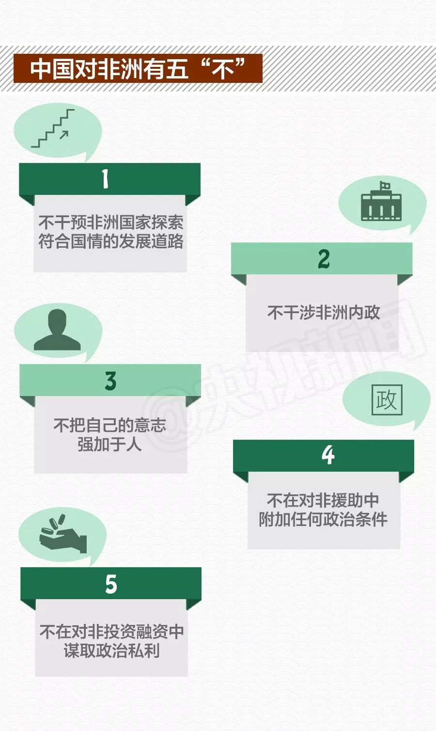 峰會能夠取得如此豐碩的成果,充分表明中非友誼深厚。在兩天的峰會期間,習近平在講話中多次表示,中國是非洲的好朋友、好伙伴、好兄弟。中非傳統友誼深厚,過去是并肩戰斗的好兄弟,現在是共同發展的好伙伴。非方領導人則表示,中國是非洲的真朋友、真伙伴、真兄弟。這三個“好”和三個“真”,充分說明中非雙方之間的友誼。而這種友誼正是建立在中國對非五個“不”的基礎上:
