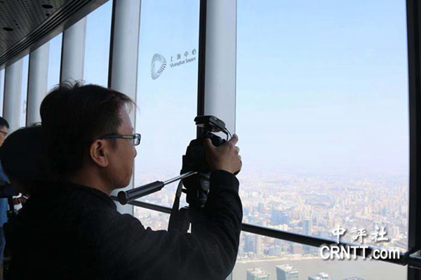 兩岸媒體記者從上海中心119層俯瞰城市風(fēng)光。(圖片來(lái)源:中評(píng)社)