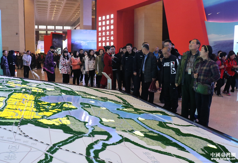 11月14日,觀眾在“壯美篇章”區(qū)觀看河北雄安新區(qū)規(guī)劃沙盤。(中國臺灣網(wǎng) 張亞靜 攝)
