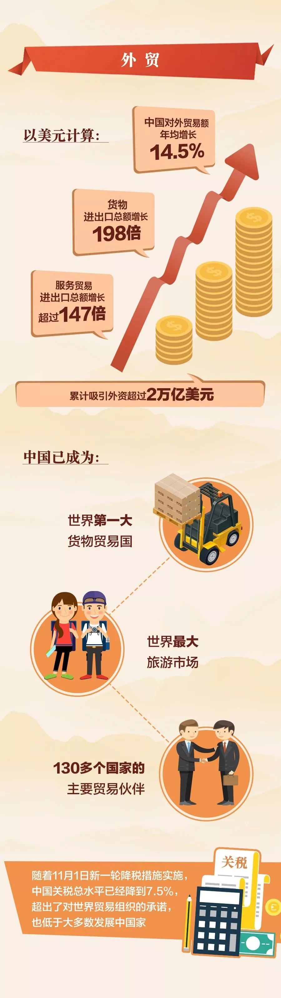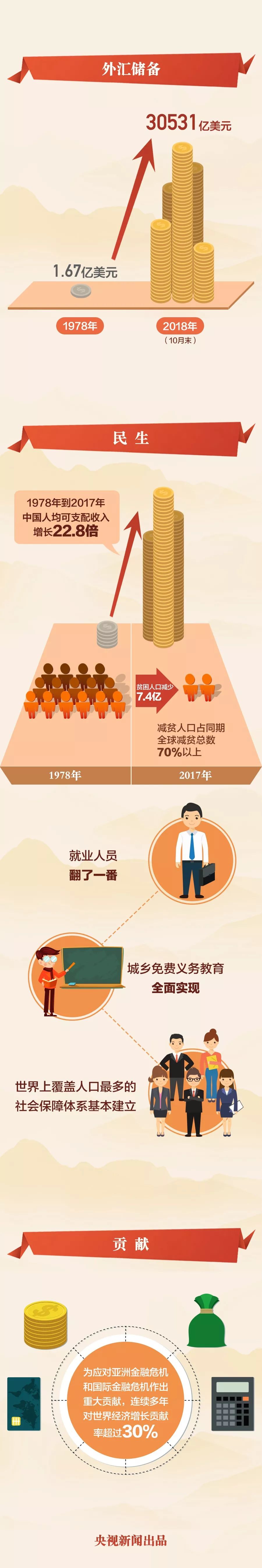 今天,中國已經(jīng)成為世界第二大經(jīng)濟(jì)體、第一大工業(yè)國、第一大貨物貿(mào)易國。用一張圖了解改革開放40年間中國的變化,感受那些令人振奮的數(shù)字↓↓