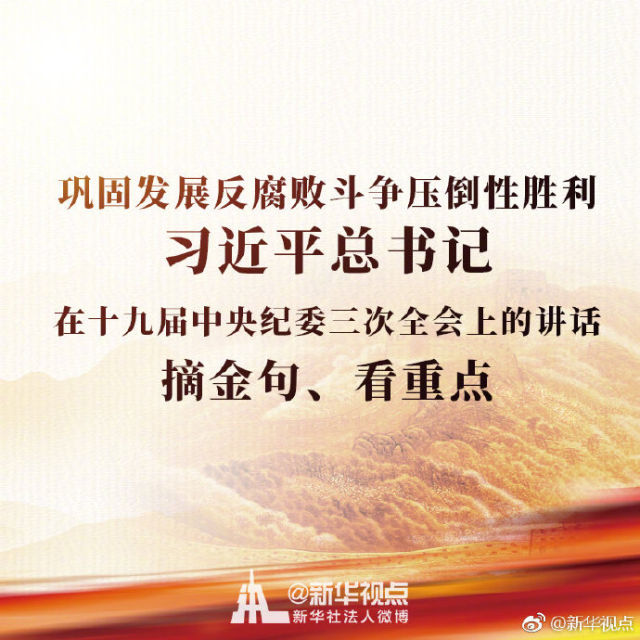 【鞏固發展反腐敗斗爭壓倒性勝利——習近平總書記在十九屆中央紀委三次全會上的講話,摘金句、看重點】中共中央總書記、國家主席、中央軍委主席習近平11日上午在中國共產黨第十九屆中央紀律檢查委員會第三次全體會議上發表重要講話。戳圖看金句。