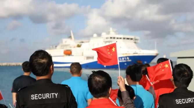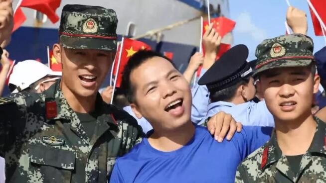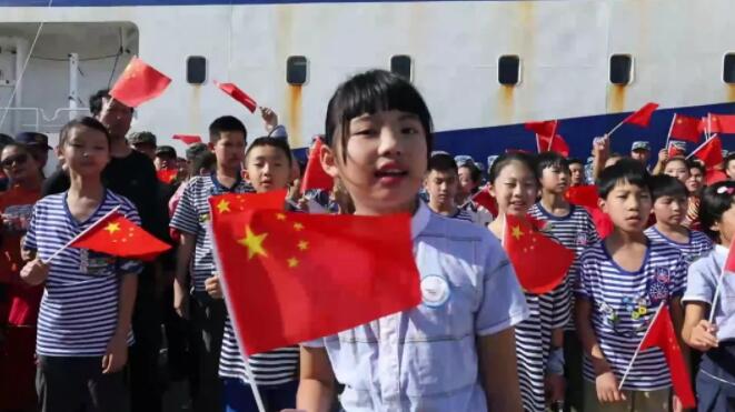 三沙市永興學校小學生胡楚涵和她的同學們、三沙衛視主持人團、“三沙1號”船工作人員、駐島工作人員、漁民依次加入演唱,清脆稚嫩的童聲與深情的歌聲交融,伴著海風,伴著朝陽,這專屬于中國人的旋律緩緩流淌。激昂的歌聲、揮動的國旗將碼頭渲染成了激情澎湃的“紅色”海洋,讓在場的每顆中國心都熱血沸騰。