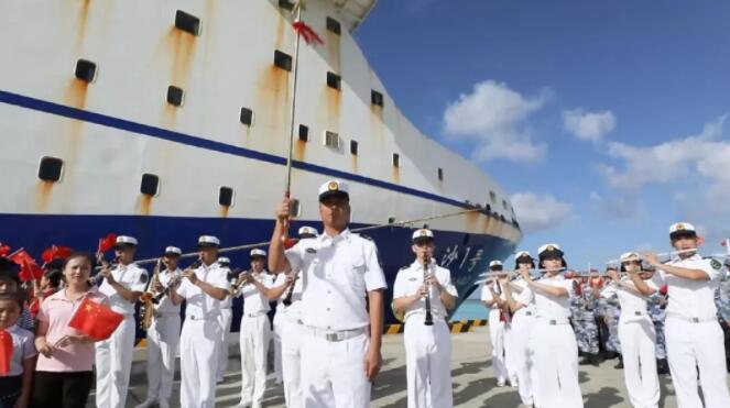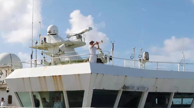 這時,甲板上突然響起了一陣溫暖的旋律,人們紛紛抬起頭,尋找聲音的來源。原來,甲板上、陸地上,91892部隊軍樂隊帥氣瀟灑的小哥哥、英姿颯爽的小姐姐們,正用手中的小號、長笛、小軍鼓、镲等十余種樂器共同奏響《我和我的祖國》優美而富有歌唱性的旋律。軍樂隊激動人心的演奏,回蕩在碧海藍天之間,喚醒三沙靜謐的清晨,吸引現場人群紛紛停下腳步,駐足觀看。