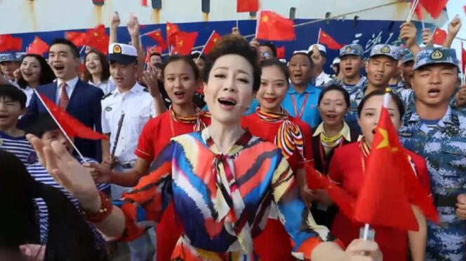 △三沙市工作人員、漁民和駐市部隊官兵揮舞著國旗,加入合唱