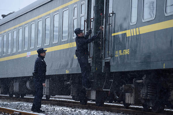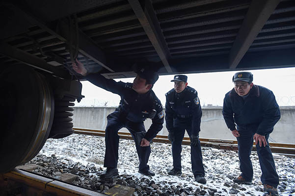 ↑武漢鐵路公安局襄陽公安處民警與鐵路職工對增開旅客列車進(jìn)行巡查。