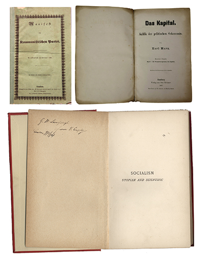 上圖為1848年《共產(chǎn)黨宣言》德文第一版。右上圖為1867年《資本論》德文第1卷第一版。下圖為恩格斯的題字贈(zèng)書(shū)《社會(huì)主義從空想到科學(xué)的發(fā)展》,1892年英文版。 中央黨史和文獻(xiàn)研究院供圖