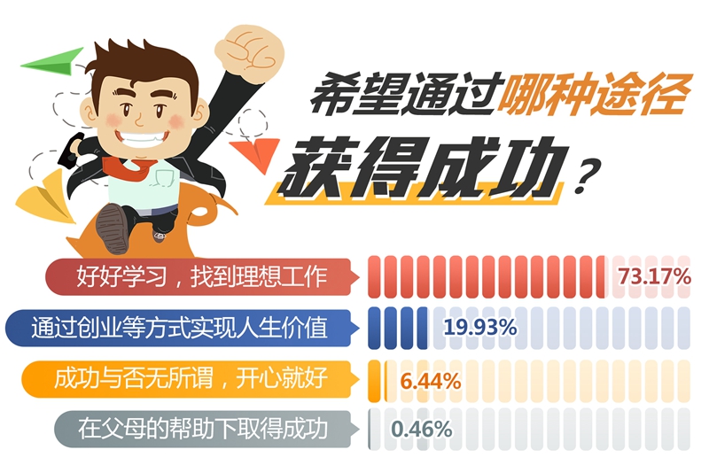 問卷調查中,93.1%的受訪大學生希望通過“好好學習,找到理想工作”和“通過創業等方式實現人生價值”兩種途徑獲得成功。