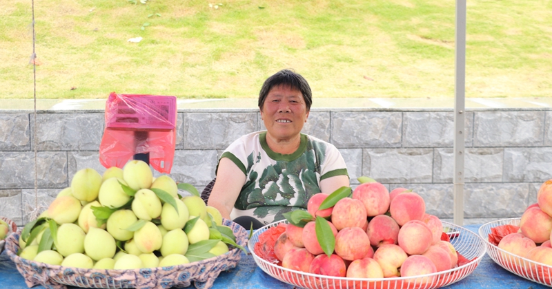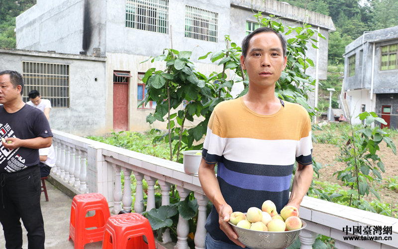 三村村村民田清端著一盤剛剛洗好的桃子迎來。(中國臺灣網(wǎng) 王莉婷 攝)