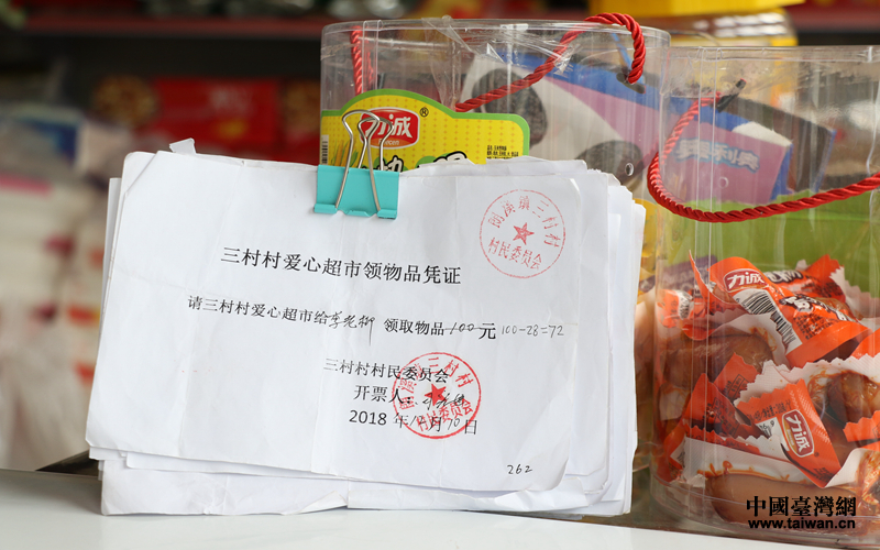 三村村愛心超市領(lǐng)物品憑證。(中國臺灣網(wǎng) 王莉婷 攝)