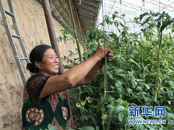 圖為劉貴榮在自家大棚打理西紅柿。新華網(wǎng)汪亞/攝